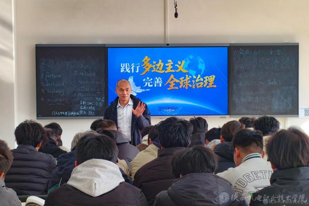 12月26日下午,学校党委副书记、校长侯晓方在启航楼402教室为25机电技术5、25机电技术6合班学生讲授形势与政策课《践行多边主义 完善全球治理》专题内容。